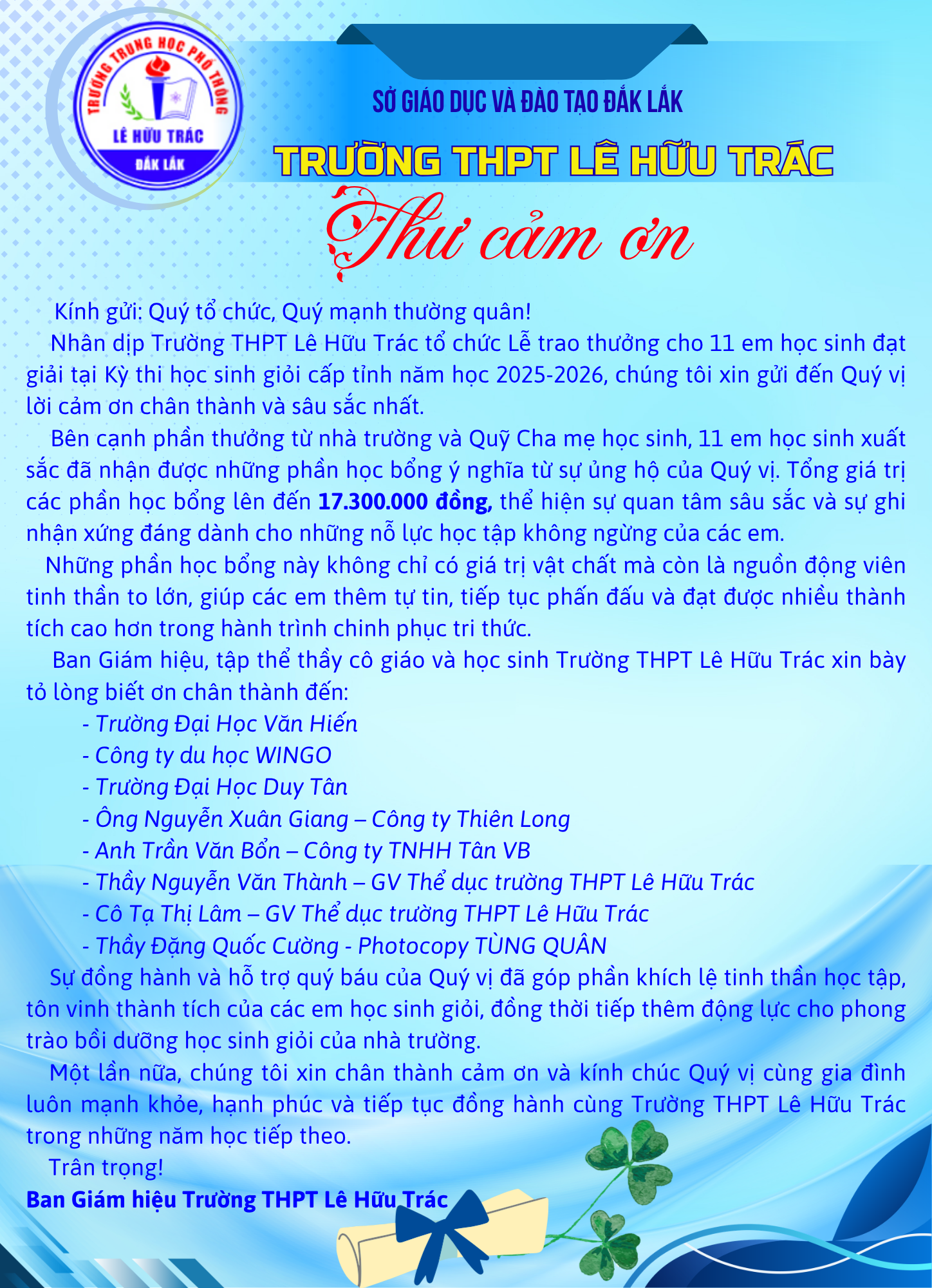 Ban Giám hiệu nhà trường xin chân thành cảm ơn sự quan tâm và đồng hành của các nhà tài trợ. Những phần học bổng này là nguồn động viên tinh thần quý báu, góp phần khích lệ các em học sinh tiếp tục nỗ lực phấn đấu, rèn luyện và đạt nhiều thành tích cao hơn trong tương lai.